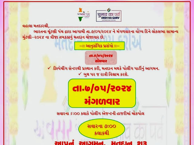 ચૂંટણી પંચ અને શિક્ષણ વિભાગ દ્વારા અનોખી રીતે ચૂંટણી પ્રચાર માટે આવી કંકોત્રી છાપવામાં આવી છે. જેમાં લગ્નની કંકોત્રીની જેમ જ મતદાન કરવા માટે મતદારને આમંત્રણ આપવામાં આવ્યું છે. અમદાવાદના મતદારોને જાગ્રત કરવા માટે સ્વામીનારાયણ વિદ્યાલય મંદિર મેમનગરના વિદ્યાર્થીઓએ કંકોત્રી વહેંચી છે. સ્કૂલના વિદ્યાર્થીઓ શહેરની સોસાયટીઓમાં જઈને મતદારોને કંકોત્રી આપીને 7 મી મેના રોજ અચૂક મતદાન કરવા અપીલ કરી