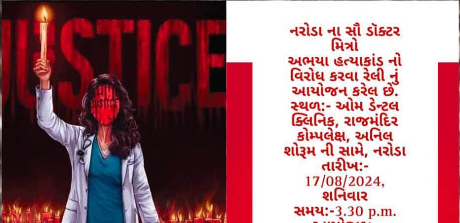 આજરોજ અમદાવાદના નરોડા વિસ્તારમાં કલકત્તા માં ડોક્ટર દીકરી પર થયેલ જધન્ય બળાત્કાર અને નિર્મમ હત્યા નો સહુ ડોક્ટર મિત્રો દ્વારા સજ્જડ વિરોધ કર્યો છે અને એના પરિવાર ને સંવેદના વ્યક્ત કરીએ છી, નરોડના તમામ ડોક્ટર દ્વારા સામૂહિક વિરોધ અને સંવેદના પ્રગટ કરવા માટે સહુ ડોક્ટર મિત્રો અને સ્નેહીજનો ની એક વિશાળ રેલી નું આયોજન કર્યું હતું,