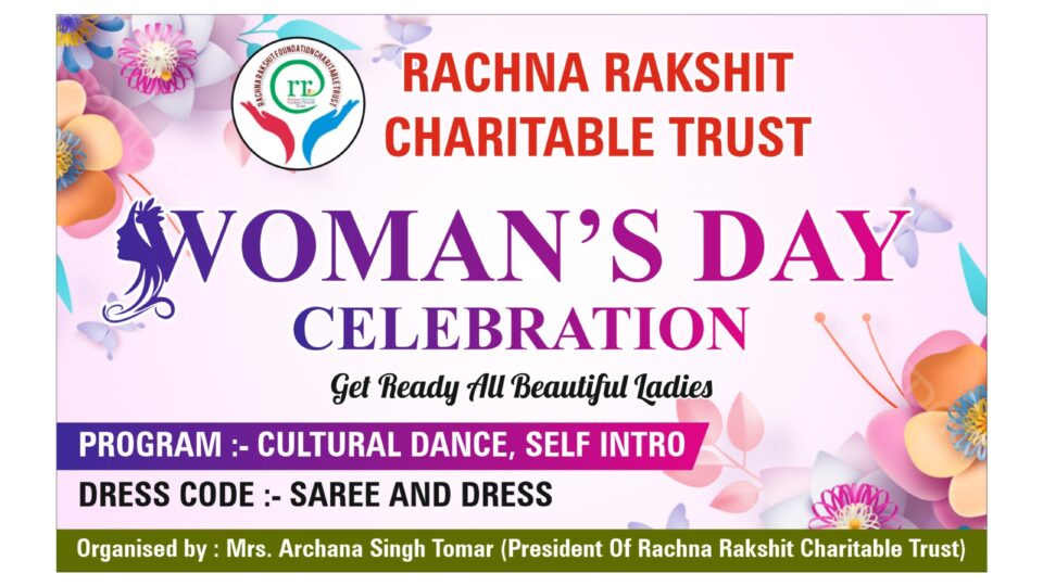 રચના રક્ષિત ચેરિટેબલ ટ્રસ્ટ ના અધ્યક્ષ શ્રી અર્ચના તોમરની અધ્યક્ષતામાં 23 માર્ચ 2025 ના રોજ મહિલા દિવસની ઉજવણી કરવામાં આવી હતી, જેમાં દરેક મહિલા જે કોઈને કોઈ રીતે કાર્યરત છે તેનું સન્માન કરવામાં આવ્યું હતું,