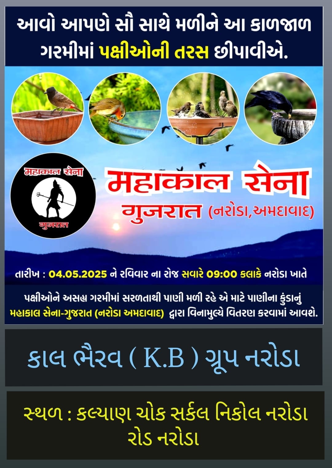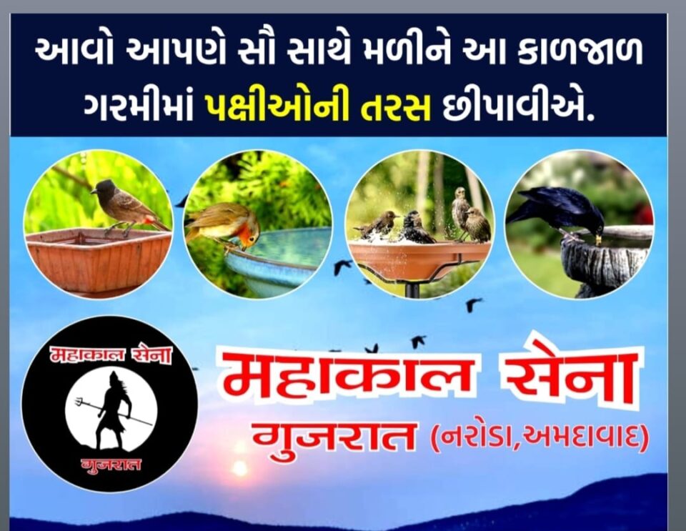 ગરમીનું પ્રમાણ દિવસેને દિવસે વધી રહ્યું છે ત્યારે ઘણા પક્ષીઓ તરસના કારણે મૃત્યુ પામતા હોય છે, આ બાબત ને ખાસ ધ્યાનમાં રાખીને આ વર્ષે મહાકાલ સેના ગુજરાત (નરોડા) તથા KB ગ્રૂપ નરોડા દ્વારા પક્ષીઓ માટે વિનામુલ્યે 500 જેટલા કુંડા નું આયોજન કરેલ છે
