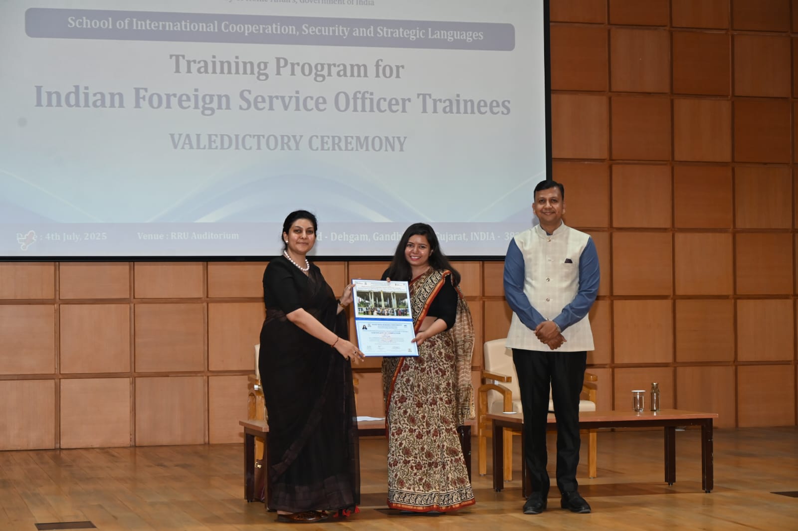 ભારત સરકારના ગૃહ મંત્રાલય હેઠળની રાષ્ટ્રીય મહત્વની સંસ્થા, રાષ્ટ્રીય રક્ષા યુનિવર્સિટી (RRU), એ સ્કૂલ ઓફ ઇન્ટરનેશનલ કોઓપરેશન, સિક્યુરિટી એન્ડ સ્ટ્રેટેજિક લેંગ્વેજીસ (SICSSL) દ્વારા આયોજિત ભારતીય વિદેશ સેવા અધિકારી તાલીમાર્થીઓ માટે ગતિશીલ અને બૌદ્ધિક રીતે નિમજ્જન તાલીમ કાર્યક્રમ સફળતાપૂર્વક પૂર્ણ કર્યો. આ કાર્યક્રમ યુવા રાજદ્વારીઓને વિદેશ નીતિ, રાષ્ટ્રીય સુરક્ષા અને વૈશ્વિક શાસનમાં અત્યાધુનિક વ્યૂહાત્મક દ્રષ્ટિકોણ અને આંતર-શિસ્ત આંતરદૃષ્ટિથી સજ્જ કરવા માટે ડિઝાઇન કરવામાં આવ્યો હતો.