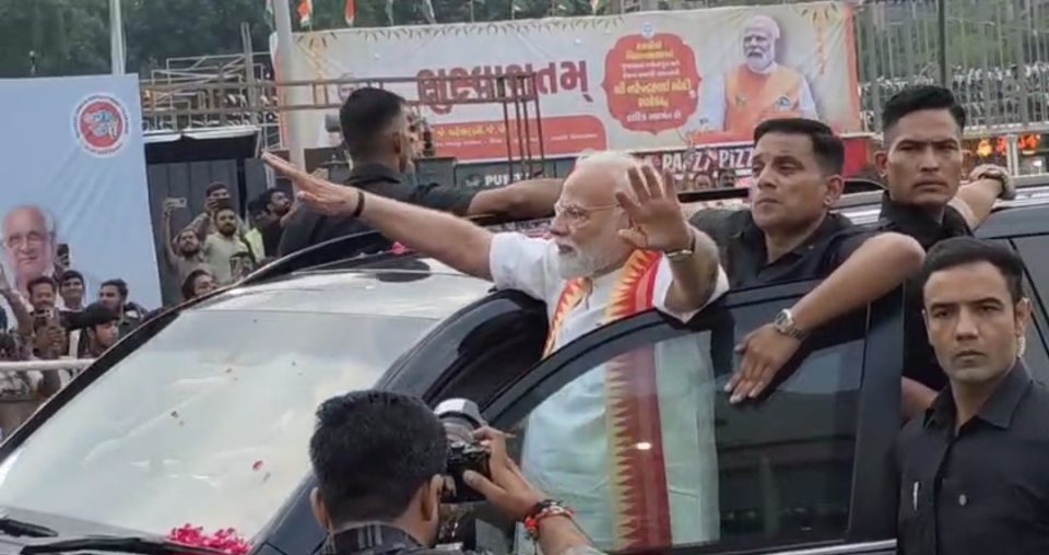 અમદાવાદના એરપોર્ટથી નિકોલ સુધી વડાપ્રધાનનો રોડ શો યોજાયો હતો જ્યાં વડાપ્રધાનને આવકારવા હજારો લોકોની ભીડ જામી