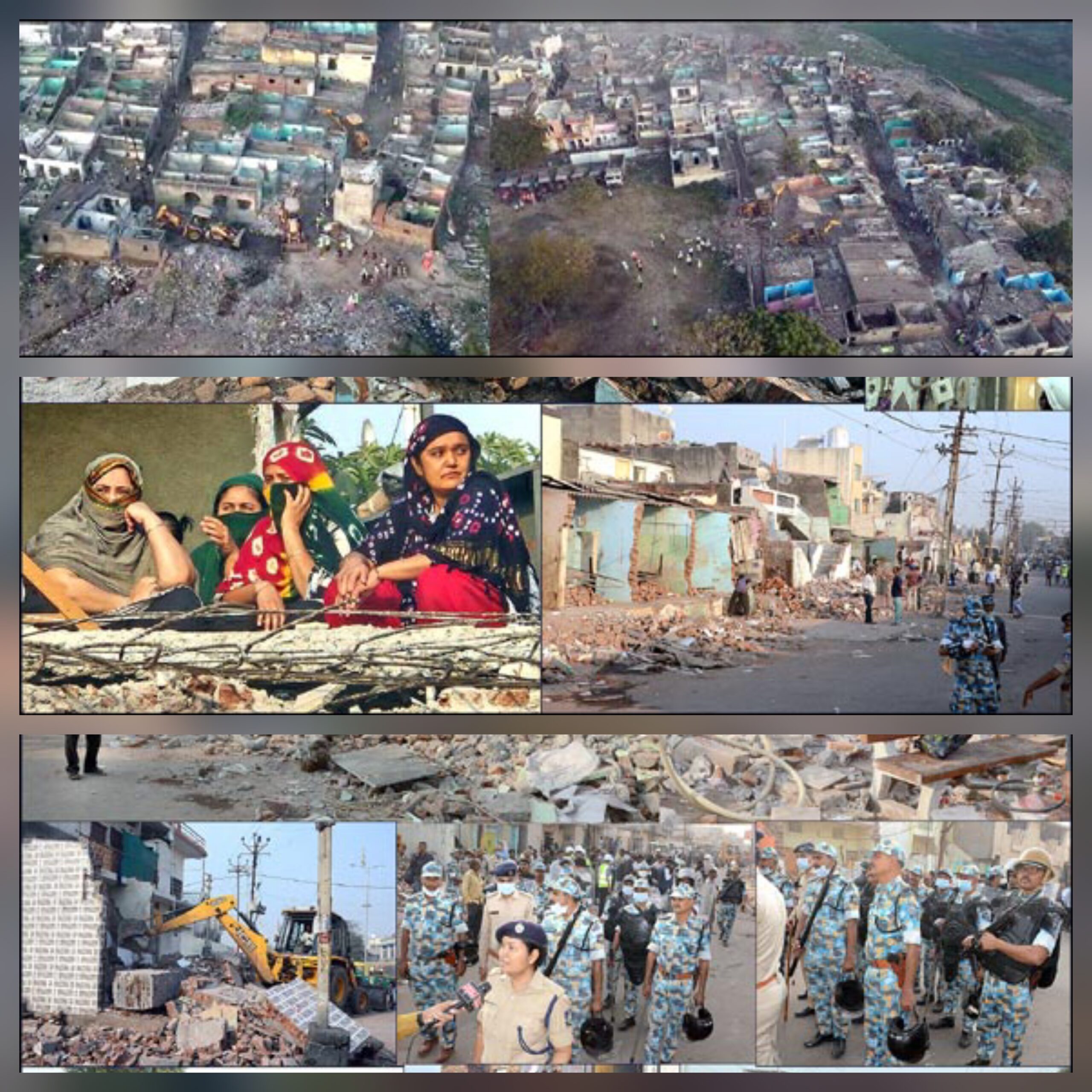 રાજકોટ કોર્પોરેશનના તંત્રે સવારથી જ બૂલડોઝરો ફેરવી દઇ દબાણનો કચ્ચરઘાણ કાઢી નાંખ્યો છે, તે નજરે પડે છે. તસ્વીરમાં જેમના દબાણ હટાવાયા તે બેઅસરગ્રસ્ત પરિવારના હાલ બેહાલ થયા છે, હવે શું થશે તેની ચિંતામાં નજરે પડે છે, અન્ય તસ્વીરમાં સઘન પોલીસ બંદોબસ્ત, વીજ ટીમો દ્વારા ધડાધડ કપાઇ રહેલા ગેરકાયદે કનેકશનો અને છેલ્લી તસ્વીરમાં તમામ પાકા મકાનોનો કડુસલો બોલાવી દેવાયો તે જણાય છે.